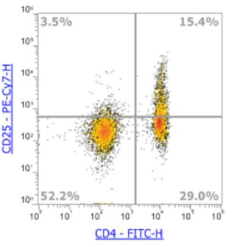Figure - Results of human peripheral blood staining for Anti-Human CD4, FITC / Anti-Human CD25, PE-Cy7 (Clone:BC96). Lymphocytes in FSC/SSC were used as a gate for analysis.